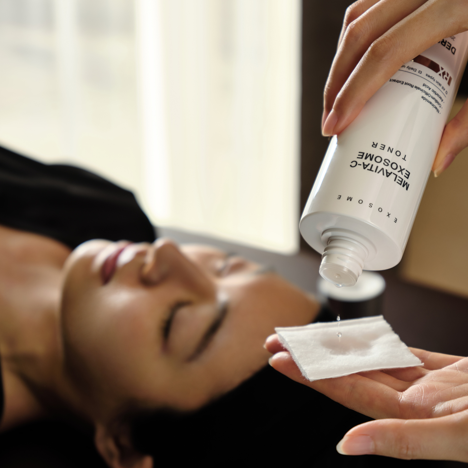 Radiant skin with DERMAFIRM's Melativa Exosome line, a curated collection dedicated to rejuvenation and balance. From the invigorating clarity of the RX Melativa Toner to the sumptuous hydration of the RX Melativa Lotion, each product is tailored to improve skin tone and reduce blemishes for clearer and more radiant skin.